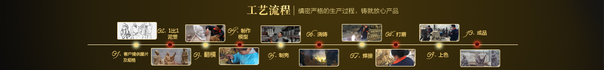 制作一件完美的鑄銅雕塑,最重要的步驟就是制作泥塑模型,然后再用工業(yè)硅膠拓印、翻模。所以泥塑的姿態(tài)、神情生動與否直接影響最終銅雕塑的品質。所以我廠一直對泥塑模型的制作格外重視。我廠以雕塑為本,以藝術為根,挾中華文化之傳統(tǒng),偕歐陸藝術之風韻,風格獨特,盡顯淋漓盡致。我們本著大膽創(chuàng)新、勇于突破的精神,以追求卓越為導向,堅持寧缺勿濫為原則,并可依照您提供的要求,為您量身設計制作。我廠人才濟濟,有智慧嚴謹?shù)墓芾戆嘧樱姸嗄贻p充滿激情、充滿創(chuàng)意的專業(yè)設計團隊、有專業(yè)技術精湛的雕塑制作人才和專業(yè)的施工隊伍。他們不僅具深厚的文化藝術底蘊,更汲取當代雕塑精華,博采眾家之長,作品既有嚴肅莊重寫實題材,也有輕松前衛(wèi)的抽象題材,表現(xiàn)手法上浪漫主義中不乏樸實,現(xiàn)實主義中蘊涵著激情,設計理念貫穿古今、融匯中西,深刻詮釋著藝術的精髓,把古典主義和后現(xiàn)代主義完美的融合,將雕塑藝術演繹為力的凝聚、美的體現(xiàn),讓人們感受到的不僅是一種藝術的浪漫與優(yōu)雅、粗獷與悲壯、更是豐富的優(yōu)秀藝術寶藏和文化傳統(tǒng),讓您在藝術與文化中穿流,在時空中飄蕩,使靈魂在藝術的海洋洗禮。 MORE+